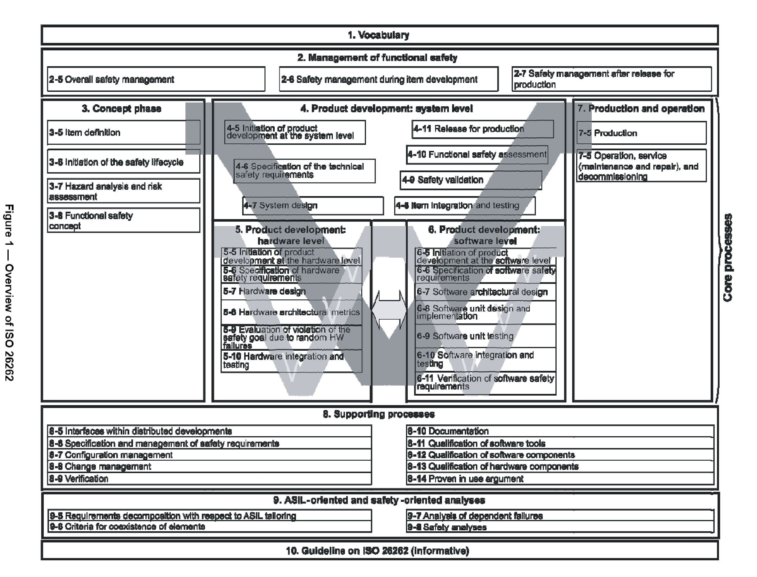 Ten volumes make up the standard (Table 1), which is designed for “safety-related systems that include one or more E/E (electrical/electronic) systems and that are installed in series production passenger cars with a maximum gross weight up to 3.5t.” Since the standard is focused on series production cars, it includes, as part 7, requirements for the production of systems, something not found in 61508, which is aimed more at industrial equipment and process plant, which are normally one-off or very low numbers. Production is seen in the context of the automotive safety lifecycle (management, development, production, operation, service, decommissioning).
