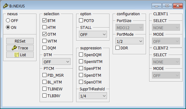 Setup is quite easy. If you have the correct Lauterbach trace hardware, plug it in to the board, power it all up, select the correct CPU type and establish a connection then the NEXUS features will have already been configured and are presented to you in the NEXUS window. Here’s a picture of one from an MPC5646.