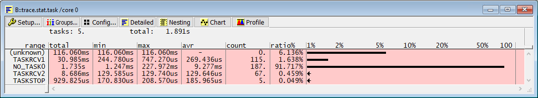 The processor is just a NEXUS client. A chip can support multiple NEXUS clients, all generating trace data to fulfil your sordid little desires for things to analyse. Think about that for a moment… What might those other clients be? A second core is one obvious answer that springs to mind, after all I did just show you a screenshot of a single RTOS running across a pair of processor cores in Symmetric Multi-Processing (SMP) fashion.