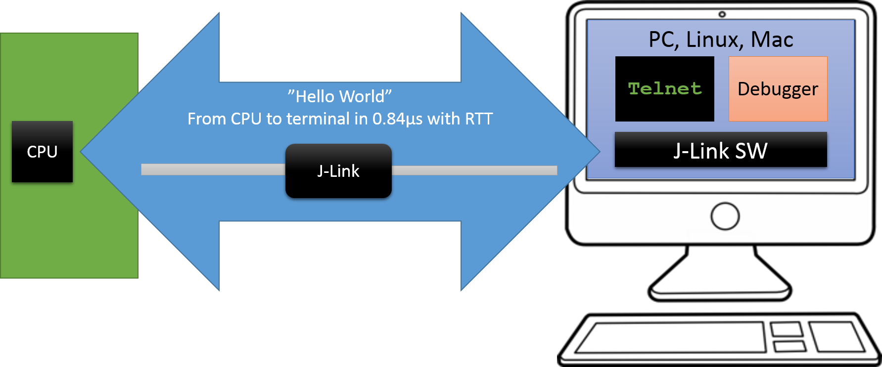 RTT does not need any additional pin or hardware, despite the J-Link connected via the standard debug port to the target. It does not require any configuration of the target or in the debugging environment and can even be used with varying target speeds.