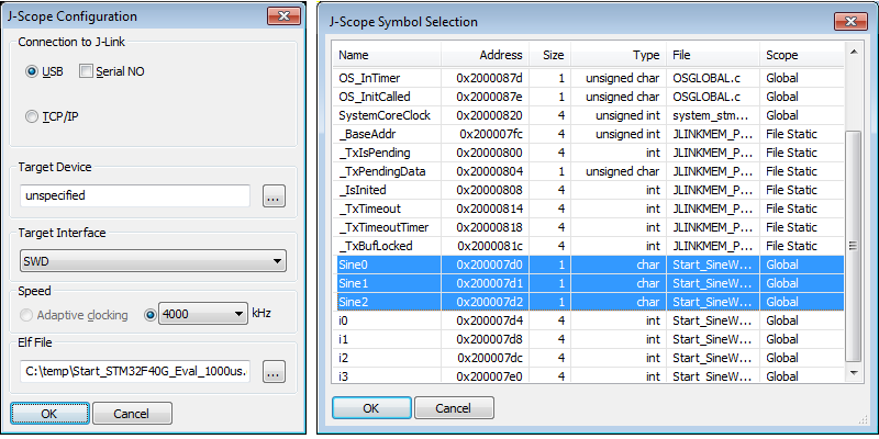 J-Scope is part of the J-Link Software and Documentation Package (JScope.exe). Start J-Scope by double-clicking on the executable. In the configuration dialogue, select your elf-file. For most targets, the configuration does not have to be specified. If there are any problems, select your target device and configure the interface accordingly. Click OK. The Symbol Selection Dialogue opens.